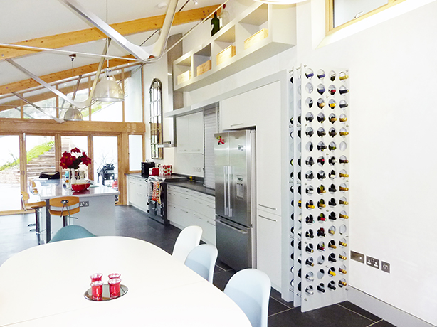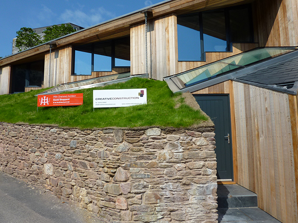 The building takes advantage of finding the perfect balance of using traditional and cutting-edge technologies for retaining structures, traditional masonry, lime render, timber-frame construction, industrial aluminium roof with sedum turf covering, ground source heat pump, water bore-hole and solar PV panels.